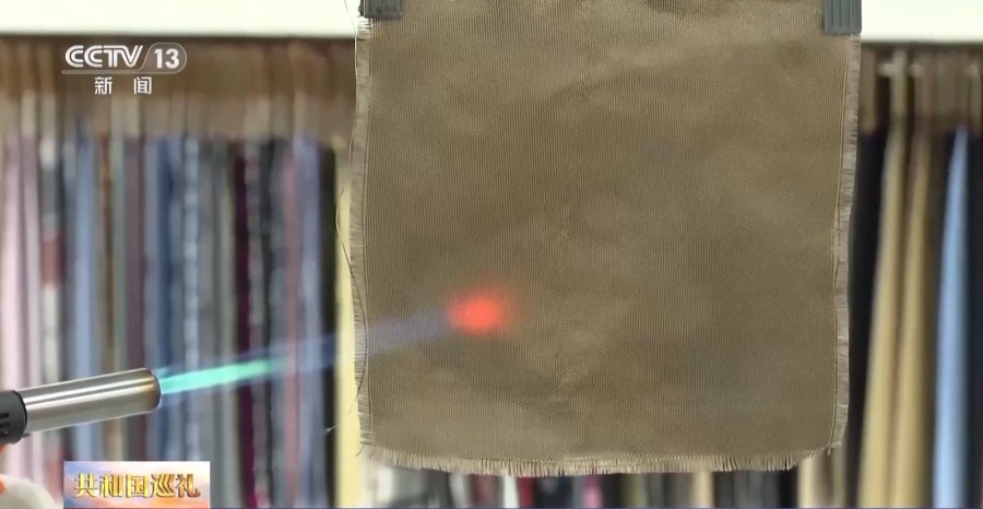 在直播間,主播向觀眾展示國旗面料的神奇之處。安徽華茂的技術(shù)研發(fā)團(tuán)隊(duì)花費(fèi)了四年時(shí)間,采用多種纖維分層防護(hù),設(shè)計(jì)了“雙防護(hù)罩”結(jié)構(gòu),同時(shí)解決了石頭纖維高模量導(dǎo)致“起小辮子”的行業(yè)難題,實(shí)現(xiàn)了高剛性無機(jī)纖維的無損成紗,一經(jīng)一緯交織滿滿都是科技范。
