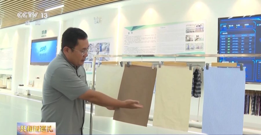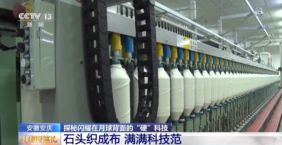 在節(jié)目展現(xiàn)安徽制造業(yè)企業(yè)環(huán)節(jié),主持人展示介紹了由安徽華茂和武漢紡織大學(xué)等科研院所制造的在月球背面展開的嫦娥六號(hào)月面國旗,并將鏡頭切到設(shè)立在安徽華茂第二工業(yè)園綜合展廳里的直播間。
